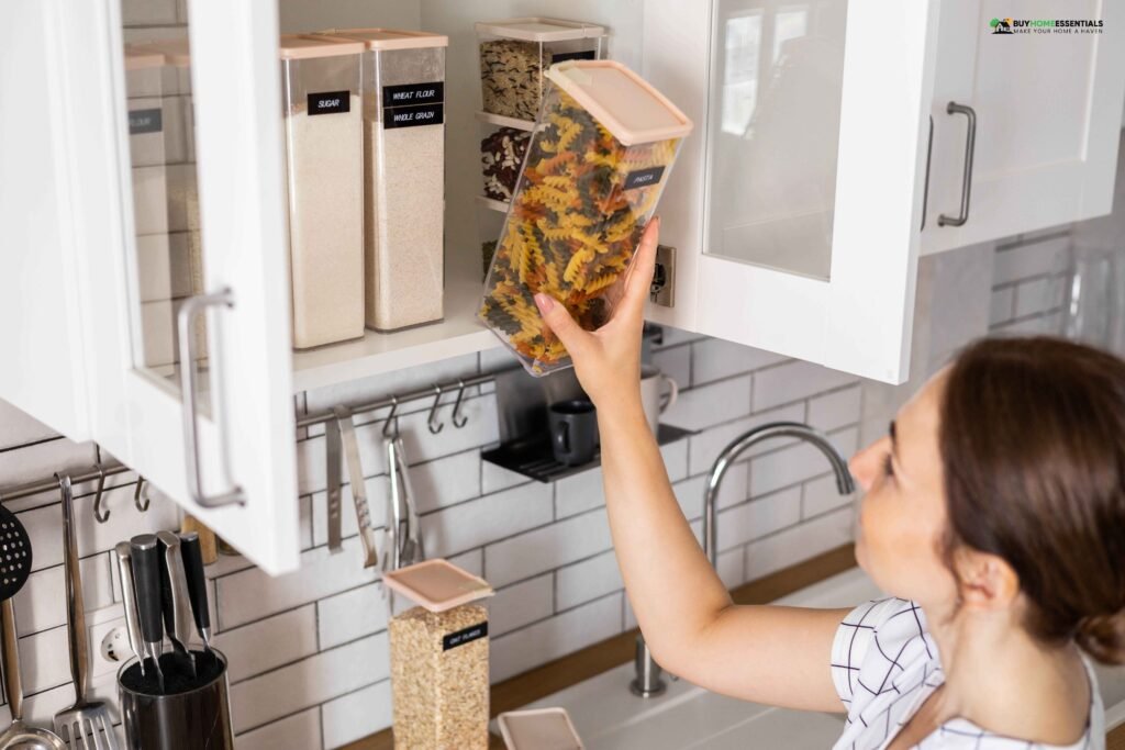 - Assign specific areas to each food category. You can organize flour, sugar, and baking essentials in a baking zone so they are easier to find.